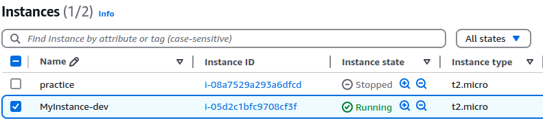 terraform apply -var-file="dev.tfvars"An EC2 Instance will be created in us-east-1 with type t2.micro